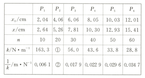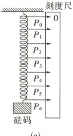 4. 某实验小组探究弹簧的劲度系数$ k $与其长度(圈数)的关系。实验装置如图(a)所示:一均匀长弹簧竖直悬挂,7个指针$ P_0 $、$ P_1 $、$ P_2 $、$ P_3 $、$ P_4 $、$ P_5 $、$ P_6 $分别固定在弹簧上距悬点0、10、20、30、40、50、60圈处;通过旁边竖直放置的刻度尺,可以读出指针的位置,$ P_0 $指向0刻度。设弹簧下端未挂重物时,各指针的位置记为$ x_0 $;挂有质量为$ 0.100\ kg $的砝码时,各指针的位置记为$ x $,测量结果及部分计算结果如表所示($ n $为弹簧的圈数,取重力加速度为$ 9.80\ m/s^2 $)。