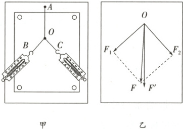 【典例1】 “探究力的平行四边形定则”的实验如图甲所示,其中$A$为固定橡皮条的图钉,$O$为橡皮条与细绳的结点,$OB$和$OC$为细绳,如图乙所示是在白纸上根据实验结果画出的图。
