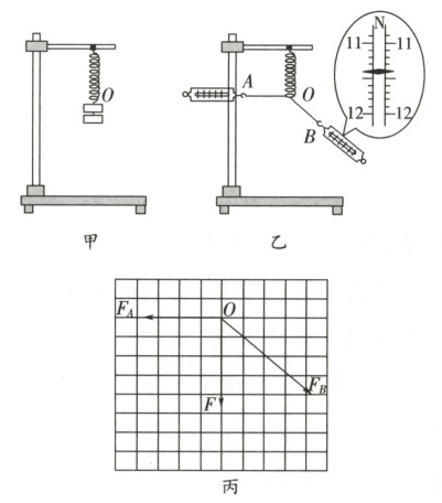 $N$。(3)该同学在坐标纸上画出两弹簧测力计拉力$F_A$、$F_B$的大小和方向如图丙所示,请在图丙中作出$F_A$、$F_B$的合力$F'$。