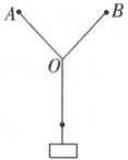 【典例3】 某同学在家中尝试探究两个互成角度的力的合成规律,他找到三条相同的橡皮筋(遵循胡克定律)和若干小重物,以及刻度尺、三角板、铅笔、细绳、白纸、钉子,设计了如下实验:将两条橡皮筋的一端分别挂在墙上的两个钉子$A$、$B$上,另一端与第三条橡皮筋连接,结点为$O$,将第三条橡皮筋的另一端通过细绳挂一重物,如图所示。