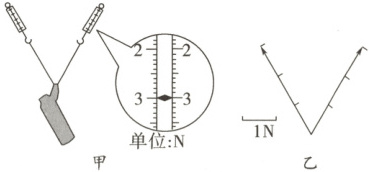 C. 将一根大约$30\ cm$长的细线从杯带中穿过,再将细线两端分别拴在两个弹簧测力计的挂钩上。在靠近白纸处用手对称地拉开细线,使两个弹簧测力计的示数相等,在白纸上记下细线的方向,弹簧测力计的示数如图甲所示