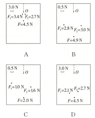 (2)题图A、D中选择的力的标度太大,不方便作图,并且题图A中表示力的作用线的点离结点太近不利于确定力的方向,选项A、D错误;题图C中实验时弹簧测力计的示数太小,作图误差较大,不利于总结实验结论,选项C错误。故只有选项B最符合题意。