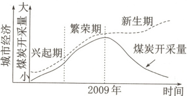 (2024·江苏南通二模)资兴作为煤炭资源枯竭型城市,2009年后,聚焦新材料、新能源、大数据、电子信息等产业和服务业,产业结构逐步实现由以第二产业为主向第二、三产业双轮驱动转变。下图为资兴市城市经济发展历程示意图。读图,完成13~15题。