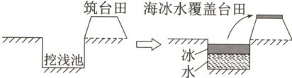 (2024·广东江门一模)我国滨海盐碱地面积广,合理开发利用盐碱地资源,是缓解我国耕地资源锐减,保证粮食安全的重要途径之一。“台田—浅池”(挖土成池、筑土为台)是我国华北地区一种新型的滨海盐碱地综合改良模式,其创新性地将新型水资源——海冰水应用在滨海盐碱地的改良利用中。下图为“台田—浅池”模式图。据此完成10~12题。