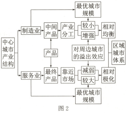 材料二 城市溢出效应是指区域中心城市对周边城市的带动作用。中心城市的产业结构对其本身及周边城市有很大影响。图2示意中心城市产业结构对区域城市体系极化与均衡演化的影响过程。