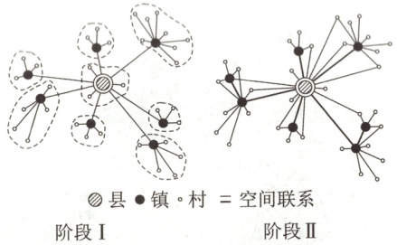 1.B 2.A 解析:第1题,交通条件的改善可以加强县一镇一村的空间联系;结合图示内容可知,与阶段Ⅰ相比,阶段Ⅱ县与镇的空间联系增强,村与镇的空间联系渠道由单一向点多重联系转变,其服务结构的变化主要得益于交通条件的改善。第2题,读图可知,与阶段Ⅰ相比,阶段Ⅱ时以镇为局域中心的半封闭式服务网络解体,县对村的服务功能增强,这会使更多村民到县城就业,镇吸引村民就业比例降低;由于交通条件改善,镇之间联系增强,镇的服务空间范围可能会扩大;随着社会经济的发展和交通条件
