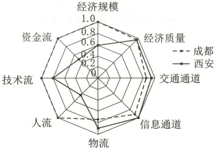 (2024·天津河东一模)下图示意我国成都、西安两个中心城市经济辐射能力,图中数值越大,表明城市在该要素上的辐射力越强。据此完成3~4题。