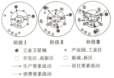 1.D 2.B 解析:第1题,读图可知,阶段Ⅰ向阶段Ⅱ发展主要表现为远郊区产业园、工业区和工业卫星城数量变多,规模变大,新建了开发区、高新区,生产要素、居住要素、消费要素流动更趋于远郊区,流动更为频繁。综上分析可知,城市各要素向郊区扩散主要得益于政府的规划引导和企业的参与。第2题,读图可知,阶段Ⅲ相较于阶段Ⅰ,远郊区形成了更多的产业园、工业区,并逐步形成了新城、新区,各要素也流向新城、新区,产城融合加强;阶段Ⅲ相较于阶段Ⅰ,产业分布并不均衡,空间结构更加复杂,居住功能并未弱化。