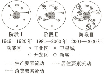(2)生产要素流向郊区,郊区就业岗位增多;(2分)居住要素流向郊区,郊区居住环境改善;(2分)消费要素流向郊区,郊区生活更加便利。(2分)