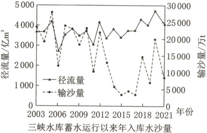 11.A 12.A 13.B 解析:第11题,读图可知,2003—2012年间,三峡水库径流量、输沙量大致呈正相关,因此该时段内三峡水库的水沙关系总体呈现正相关。第12题,上游水库修建后,会拦水拦沙,导致入库输沙量减少;材料没有体现上游水土保持的措施;上游人口和经济规模较小,用水增多对径流量影响不大,不会导致入库输沙量减少;气候较为稳定,长江上游地区的降水年变化小,降水不会异常减少。第13题,三峡水库蓄水以来,发电量大,所发挥的环境效益表现在以清洁的水电替代火电,可大量减少火力发电产生的有害气体和温室气体,减少了大气环境污染;三峡水库蓄水后,降低该河段径流流速,不利于降解更多的污染物,不利于水体的净化;鄱阳湖生态环境的保护主要与湖区和赣江流域有关;改善下游通航条件不属于环境效益。