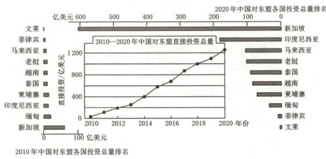 12.B 13.D 14.B 解析:第12题,读图可知,从2010—2020年间,我国对东盟各国的投资总量持续增加,不是波动上升;2017年的投资总量有了显著的增加;从2010—2020年期间,中国对东盟各国的投资量差别很大;对比2010年,2020年我国对东盟各国的投资量变化也很大。第13题,新加坡经济发达,我国企业投资新加坡看中的是新加坡先进的管理经验;新加坡面积狭小,资源匮乏,人口数量少,市场狭小,劳动力价格较高,企业工资成本高。第14题,“一带一路”倡议有利于促进东盟各国的产业发展和经济发展,促进我国与东盟各国的联系,也可以形成整体区域经济发展的联动,共同保护环境;“一带一路”倡议无法统一各国的发展水平。