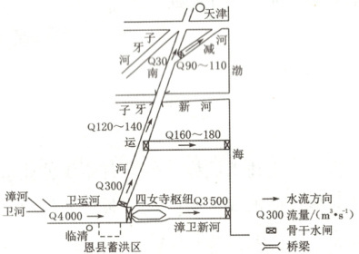 (2024·山东高三联考)减河是海河流域通过天然或人工河道分泄江河超额洪水的水利设施。作为大运河的配套工程,减河多选址在地势低洼处,至今仍发挥着泄洪、灌溉等功能。下图示意海河卫运河段减河工程。据此完成1~2题。