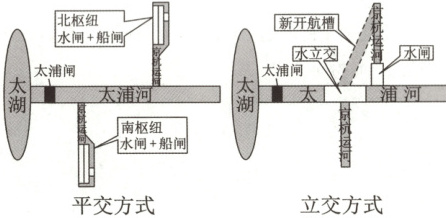 (2024·河南高三联考)太湖流域治理需要统筹考虑多河道防洪、治污、引水、航运等功能。太浦河是太湖流域最大的人工河道之一,西起太湖,东至黄浦江,既是太湖洪水的主要排泄通道之一,也是太湖向下游地区供水的骨干河道。京杭运河是长江三角洲高等级干线航道之一,与太浦河在苏州市交汇。下图是太浦河和京杭运河两种交汇方式示意图,其中平交方式是在京杭运河入太浦河处设置水闸及船闸,立交方式是通过设置水立交使两河减少直接水体联系。据此完成3~5题。