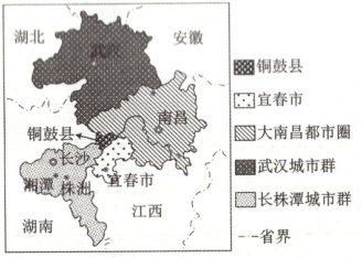 (2024·河北保定一模)江西省宜春市铜鼓县地处湘赣交界处,其工业化、城镇化发展明显滞后于周边其他县级行政单元,是区域发展中的“洼地”,但也相应保留了较好的自然生态资源和历史文化遗存。下图示意铜鼓县位置及周边概况。据此完成17~18题。