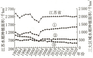 (2024·江苏南通一模)稳定和适当提升水稻种植面积是保证国家粮食安全的重要途径之一。江苏省从20世纪50年代开始在苏北推行“旱改水”耕作制度改革,将旱地改为水田。下图为1992—2021年江苏及省内三大区域水稻种植面积统计图。据此完成21~22题。