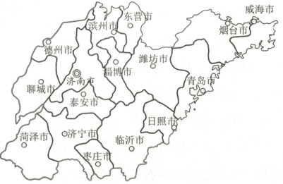 23. 国务院批准的山东自贸试验区总体方案涵盖济南、青岛、烟台三个片区。其中济南片区重点发展人工智能、产业金融、医疗康养、文化产业、信息技术等产业,开展开放型经济新体制综合试点试验,建设全国重要的区域性经济中心、物流中心和科技创新中心。下图为山东省政区简图。据此回答下列问题。(12分)