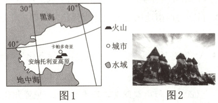 25.(1)位于高原,地处地中海气候区,夏季受副热带高压控制,降水较少,气候较干旱,故区域内林木稀少。(4分)谷地有利于水分汇集,蒸发较弱,水分条件较好;(2分)谷地内地势低平,土层较厚,土壤条件较好,树木生长茂盛。(2分) (2)该地林木稀少,缺少建筑木屋的原材料;(2分)石柱的主体是较松软的凝灰岩,开挖洞穴的难度低;(2分)洞穴的顶部是坚硬的玄武岩,稳固且维护成本低;(2分)当地冬冷夏热,石柱开挖的洞穴具有冬暖夏凉的特点,更加适合居住。(2分) (3)夏季。(2分)原因:夏季该地受副热带高压控制,天气较稳定,热气球起飞成功率高;(2分)夏季盛行下沉气流,风速小,热气球飞行稳定安全;(2分)夏季天气晴朗,能见度高,视野开阔,利于欣赏美景。(2分)