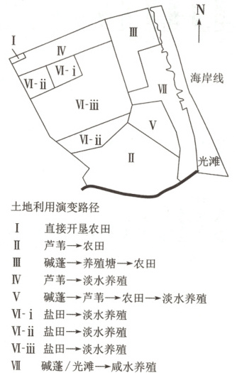 (2024·广东江门高三联考)滨海湿地水盐关系复杂,盐度空间梯度是影响土壤、水体指标和生物生长的关键因子。随着土地利用方式的变化,水土盐度也随之发生改变。下图示意我国盐城市某滨海湿地土地利用演变路径。据此完成4~5题。