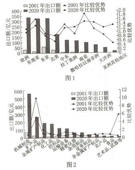 (2024·吉林白山一模)在全球化与“国内、国际双循环”新格局下,京津冀城市群在既开发国内市场,又拓展国际市场中的角色和作用亟须明确。其中,“外循环”部分主要通过出口数据考察京津冀城市群相较于其他地区参与全球价值链的程度与分工优势(比较优势:表示某区域特定产品出口在世界同类产品出口中的份额比率)。图1为京津冀城市群在各出口市场出口额与比较优势图,图2为京津冀城市群不同产品出口额与比较优势图。据此完成6~7题。