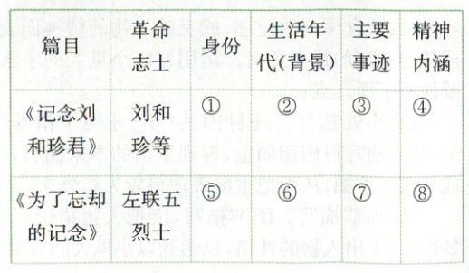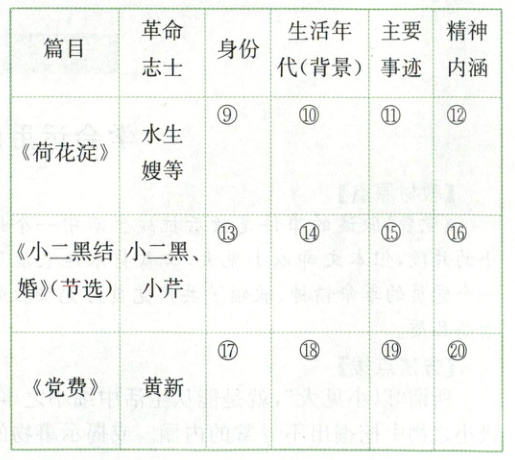 3.①女大学生 ②20世纪20年代 ③订进步刊物《莽原》;反抗“广有羽翼的校长”;为国请愿,英勇牺牲 ④追求真理,忠心爱国,不畏强权 ⑤青年作家 ⑥20世纪30年代 ⑦创办社团,翻译作品,宣传革命真理 ⑧追求真理、光明,勇于斗争 ⑨农村妇女 ⑩抗日战争时期 ⑪支持丈夫参军抗日,拿起枪上战场杀敌 ⑫坚决支持中国革命,保家卫国 ⑬农村青年 ⑭抗日战争时期 ⑮反对包办婚姻,追求自由恋爱,反对封建迷信,同恶势力作斗争 ⑯破除迷信,男女平等,婚姻自由 ⑰地下党员 ⑱第二次国内革命战争时期 ⑲送丈夫参加红军;组织党员活动,在极度贫困下集咸菜缴党费;为掩护同志英勇牺牲 ⑳忠于党,忠于人民,不怕牺牲