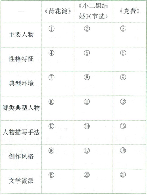 2.①水生嫂、水生 ②小二黑、小芹 ③黄新 ④勤劳善良、深明大义 ⑤热情纯朴、活泼乐观 ⑥自信乐观、果断刚毅 ⑦抗日战争时期冀中水乡 ⑧抗日战争时期山西某根据地 ⑨第二次国内革命战争时期革命根据地 ⑩中国传统劳动妇女、抗日根据地进步青年 ⑪新型农民 ⑫党性与人性完美统一的革命者 ⑬语言描写、外貌描写 ⑭白描、排比、比喻、对比 ⑮语言描写、细节描写 ⑯清新优美、富有诗情画意 ⑰通俗生动、乡土气息浓烈 ⑱简约明了、情节节奏紧张 ⑲荷花淀派 ⑳山药蛋派 ㉑革命现实主义