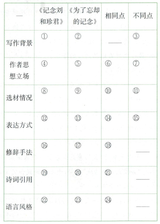 1. 《记念刘和珍君》和《为了忘却的记念》都是鲁迅为纪念牺牲的进步青年所写的回忆性散文,在选材、作者思想立场、表达方式、语言风格等方面既有共性又有明显不同,试简要分析,完成下面表格。
