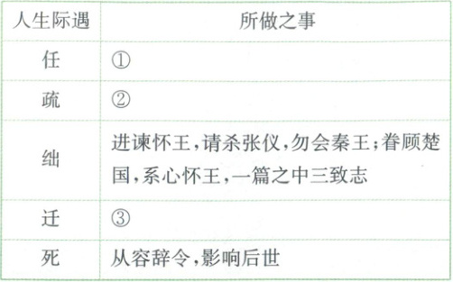 1. 对于“列传”二字,张守杰在《史记正义》中解释为:“其人行迹可序列,故云列传。”这是司马迁首创的人物传记体例,后世多沿用之。请跳读课文,圈画出描述屈原人生际遇的关键词,并根据表格中的提示,尽量用原文概括屈原所做之事。
