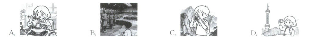 1.B [解析]图片理解题。根据“The Terracotta Army in Xi’an is a wonder in the world”可知,滕飞在西安参观了兵马俑。故选B。