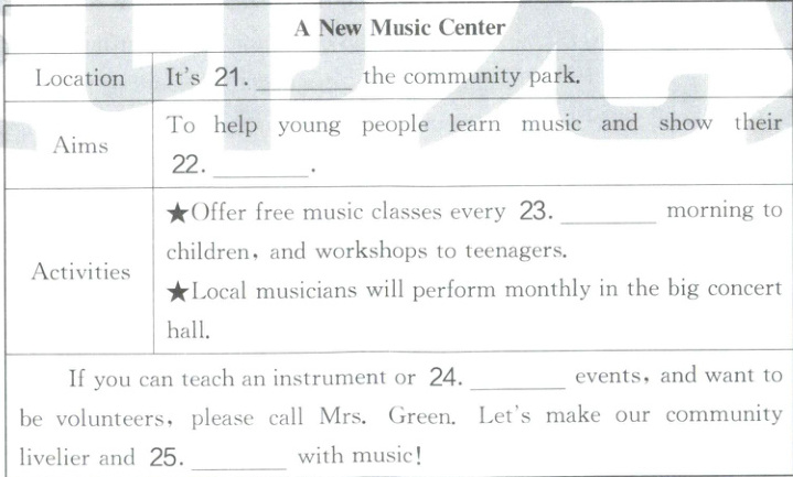 (五)听短文,填表格。根据短文内容,写出下面表格中所缺信息,每空一词。短文读三遍。你将有 20 秒钟的时间阅读表格内容。