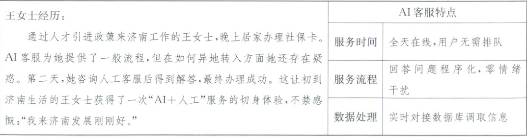 4. AI客服虽然全天在线 程序化回答 无情绪干扰且能实时调取信息 但面对王女士异地转入社保卡这类个性化 复杂问题时 无法精准解答(2 分) 而人工客服能针对具体情况提供有效帮助 所以“AI+人工”客服可优势互补 满足用户的多样需求 有存在的必要(2 分)