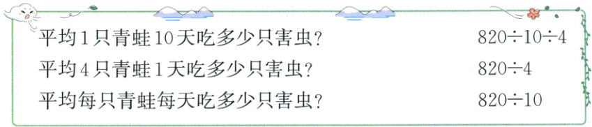 5. 4只青蛙10天吃害虫820只,请根据下面的问题找到对应的式子并连线。