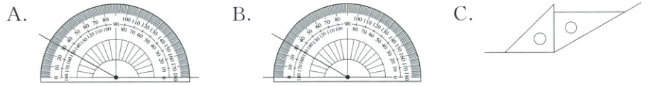 [解析]一个三角板的度数是45°、45°、90°,另一个三角板的度数是30°、60°、90°。看这个角是由三角板上的哪两个角的度数相加或相减得到的即可。15°=45°−30°,75°=45°+30°,165°=90°+45°+30°。