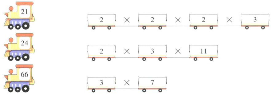 3. [习题变式] 车头上的数可以写成哪几个质数相乘的形式?连一连。