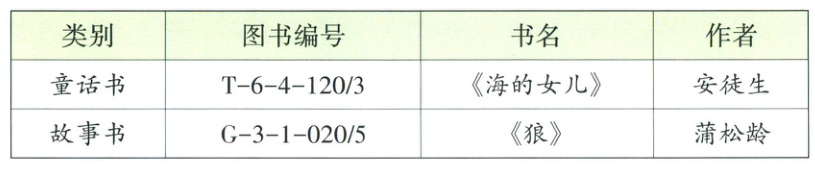 (1)《狼》的图书编号中,G表示故事书,在3号书架1层,本书书号为020,共有5本书。猜一猜:T-6-4-120/3表示什么?