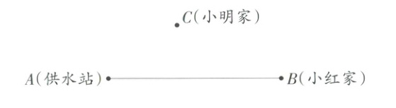4.[习题变式]从供水站到小红家铺设了一条自来水管道$AB$。如果要从小明家到自来水管道$AB$接通一根水管,请你设计并画出所接水管的最短路线。