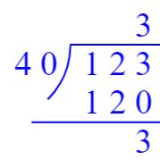 $\begin{array}{r}&&&\\40\overline{)123}&\\\end{array}$ $\begin{array}{r}&&&\\50\overline{)256}&\\\end{array}$ $\begin{array}{r}&&&\\90\overline{)718}&\\\end{array}$