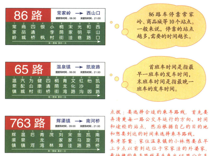 点拨:要选择合适的乘车路线,首先要弄清楚每一路公交车运行的方向、时间和途经的站点,然后根据自己的目的地和想要到达的时间来选择乘车路线。