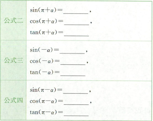一、$-\sin \alpha$ $-\cos \alpha$ $\tan \alpha$ $-\sin \alpha$ $\cos \alpha$ $-\tan \alpha$ $\sin \alpha$ $-\cos \alpha$ $-\tan \alpha$