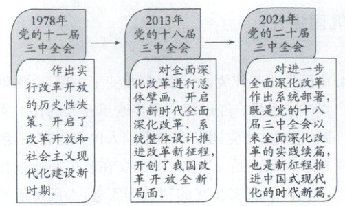 情境二 “从五千多年中华文明的传承中一路走来,‘中国’二字镌刻在‘何尊’底部,更铭刻在每个华夏儿女心中。党的二十届三中全会胜利召开,吹响进一步全面深化改革的号角。我们乘着改革开放的时代大潮阔步前行,中国式现代化必将在改革开放中开辟更加广阔的前景。”——节选自习近平主席2025年新年贺词