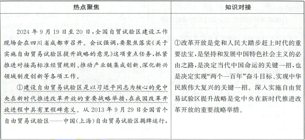 1.提示:①根本原因:中国共产党带领全国人民,开辟了中国特色社会主义道路,形成了中国特色社会主义理论体系,确立了中国特色社会主义制度,发展了中国特色社会主义文化。②我国坚定不移走中国特色社会主义道路,在建设自贸区方面探索出具有中国特色的发展道路。③贯彻落实中国特色社会主义制度,我国自贸区建设发挥集中力量办大事的制度优势,举国上下一条心。④发展中国特色社会主义文化,在自贸试验区建设中始终坚持充分弘扬中国精神。