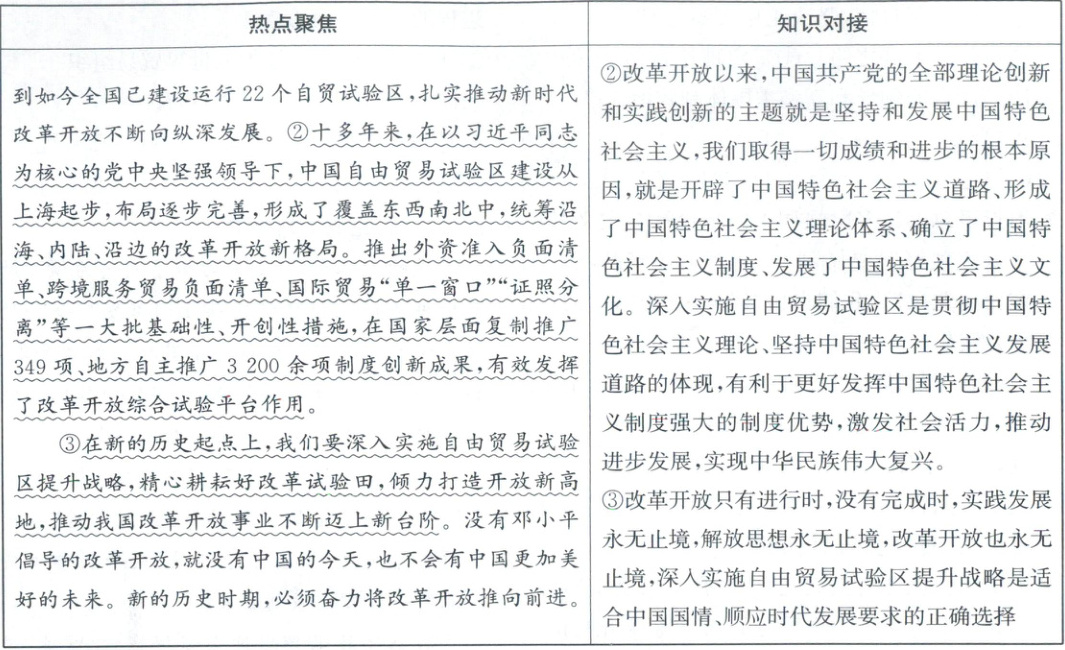 1. 结合材料,运用“中国特色社会主义的创立、发展和完善”的知识,分析自贸试验区建设取得优异成绩的原因。