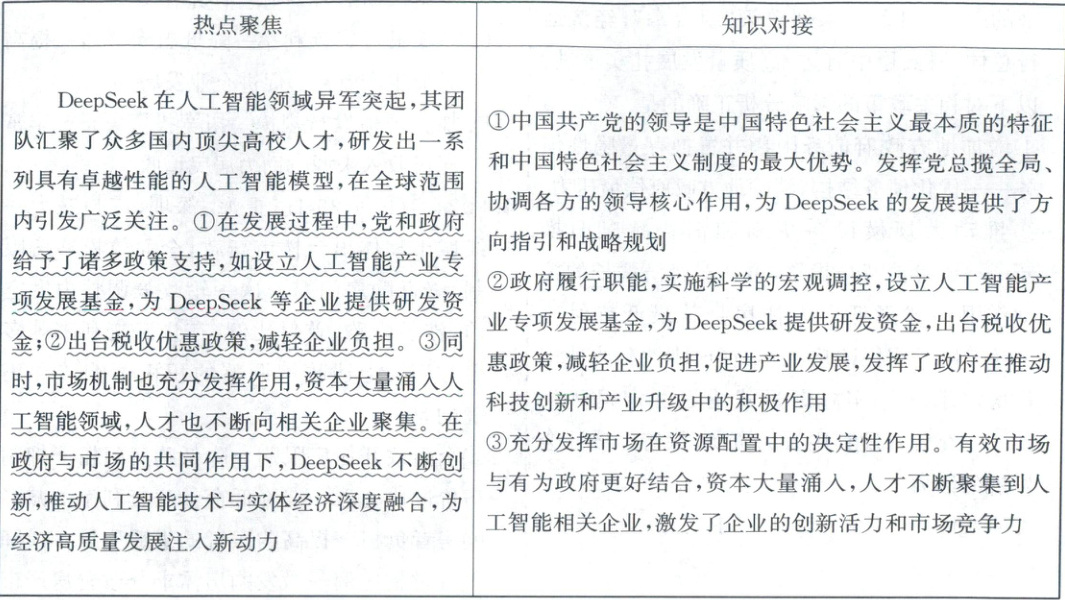 1. 结合材料,运用《经济与社会》的知识,分析DeepSeek的发展是如何体现我国社会主义市场经济体制优势的?