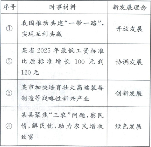5.B 解析:我国推动共建“一带一路”,实现互利共赢的开放战略,推进高水平对外开放,体现开放发展,①正确。某省2025年最低工资标准比原标准增长100元到120元体现了共享发展,而非协调发展,②错误。某市加快培育壮大高端装备制造等战略性新兴产业,不断推进科技创新,坚持创新在我国现代化建设全局中的核心地位,体现坚持创新发展,③正确。某县聚焦“三农”问题,察民情、解民忧,助力农民增收致富体现了共享发展,而非绿色发展,④错误。