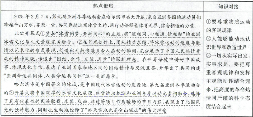 1.①物质决定意识,要求我们一切从实际出发,实事求是。第九届亚洲冬季运动会开幕式的设计充分考虑了多方面实际情况。紧扣“冰雪同梦,亚洲同心”的主题,这是基于亚洲冰雪文化交流以及共同发展的实际需求,将“道相同、心相通、情相融”的亚洲冰雪文化与人文景观完美呈现,在艺术创作上也依据这一主题,展现冰雪运动的速度与激情,传递深刻理念,做到了从实际主题出发。②一切从实际出发,实事求是,要求我们把发挥主观能动性和尊重客观规律结合起来。哈尔滨市作为中国著名冰城和现代冰雪运动发源地,开幕式选择具有代表性的民族歌舞、乐器、戏曲、非遗等项目作为暖场节目内容,将中国深厚的冰雪文化底蕴、冰雪运动积淀和亚洲冬季运动元素相融合,充分利用了哈尔滨市当地的实际文化和运动基础,生动地诠释了“冰天雪地也是金山银山”的理念,这是从哈尔滨市的地域特色实际出发进行的设计,所以开幕式设计具有合理性。