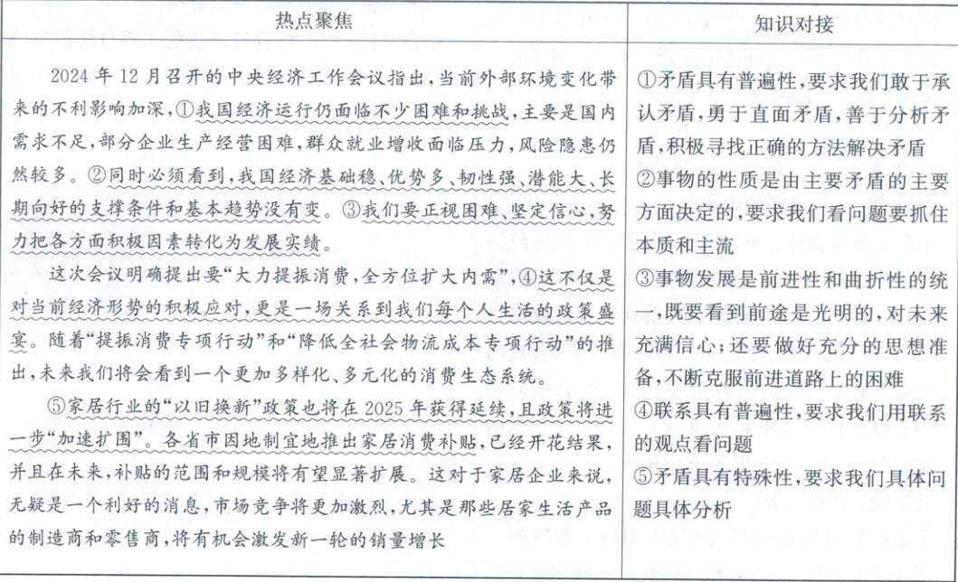 ③联系具有多样性,要求我们善于分析和把握事物存在和发展的各种条件,要一切以时间、地点和条件为转移。在当前经济形势下,统筹扩大内需和深化供给侧结构性改革,充分考虑了国内市场的需求状况、产业发展现状等多种条件,有利于实现经济的高质量发展。