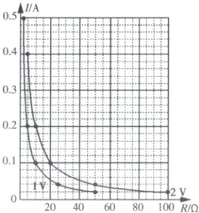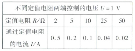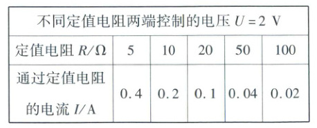 代替多个不同阻值的定值电阻,这样操作会更方便些。(2)为了得出普遍规律,需要多次测量数据,其前提就是让控制的电压保持在另一个数值不变,如$ 1 \, V $等,多次测量数据见表格二。