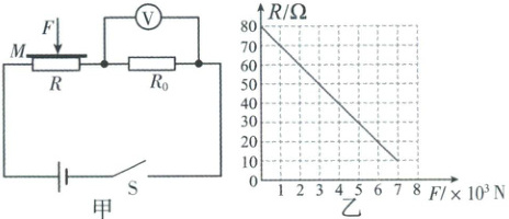 5. (2023河南)某物理实践小组设计了一种工程上的压力测量装置,其原理如图甲所示,电路中电源电压恒为6 V,定值电阻$R_0$的阻值为20 Ω,电压表的测量范围为0~3 V,轻质绝缘的压力检测板M与可变电阻R相连。R的阻值与压力F的关系如图乙所示,闭合开关S后,试问:
