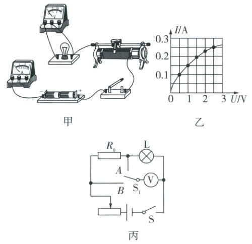 。(5) 完成上述实验后,小明又设计了一种测额定功率的方案,如图丙所示,$R_0$ 是阻值已知的定值电阻。请完成以下问题: