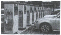 7.(2025 凉山)🛟跨学科实践🪜 随着新能源电动汽车销量增长,充电桩的安装率不断提高。据了解,充电桩输出电压的范围是$300 \sim 600 \ V$,峰值功率高达$500 \ kW$。如图所示,充电站内各充电桩是