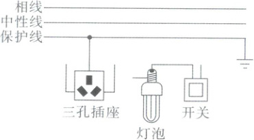 [解析]家庭电路中,开关控制灯泡时,开关要接在相线与灯之间。这样连接,开关既能控制灯泡,又能在灯泡损坏时,断开开关,切断相线,更换灯泡更安全;三孔插座的正确连接方法:上孔接地(保护)线,左孔接零(中性)线,右孔接火(相)线。